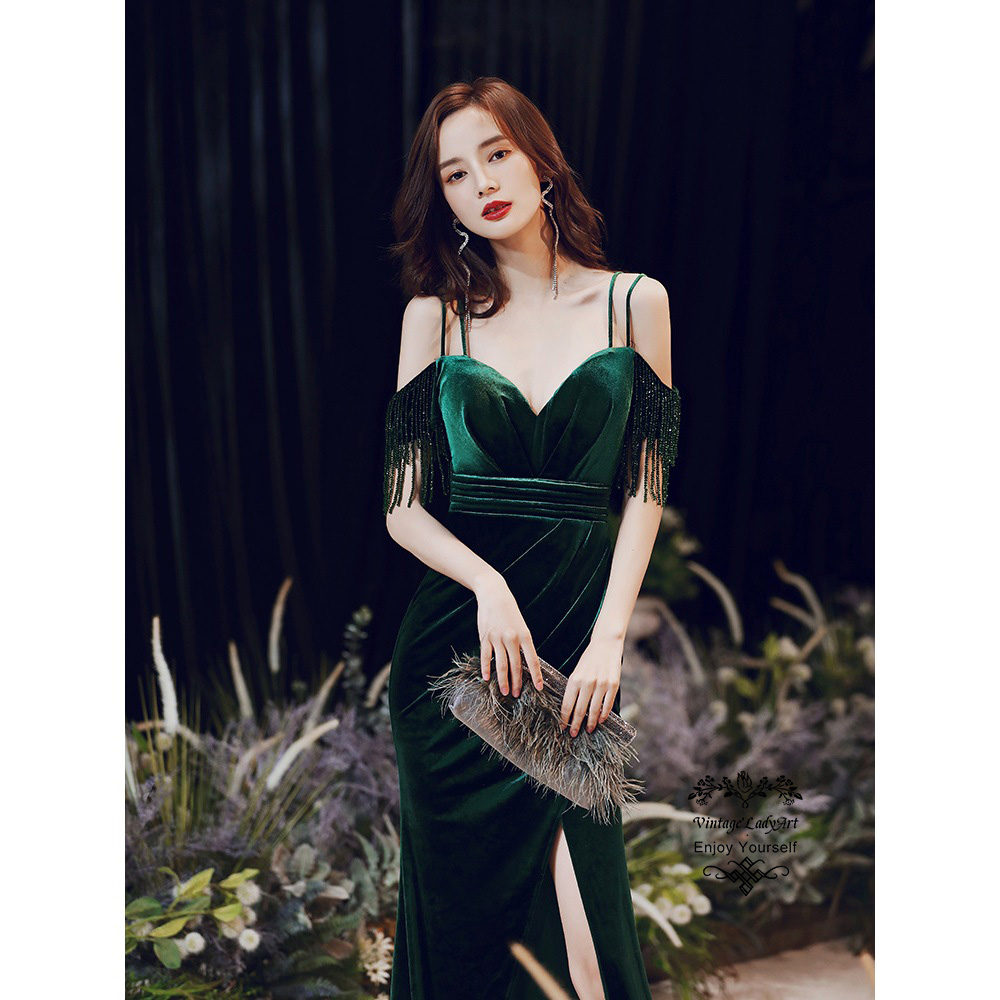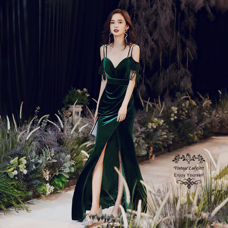 High-Slit Gown Charleston Wedding Velvet Dress,1920s Gatsby ,Bridesmaid Reception Gown,Beading Fringe Music Evening Long Gown,Guest dress